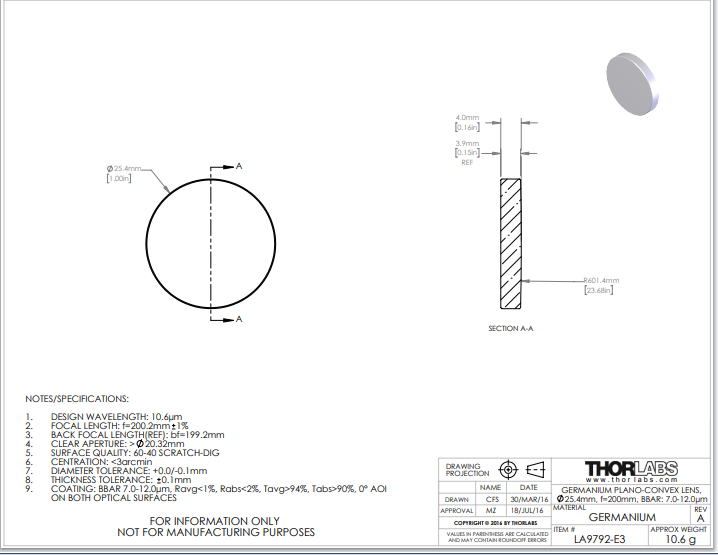 Thorlabs索雷博 LA9792-E3 平凸透镜