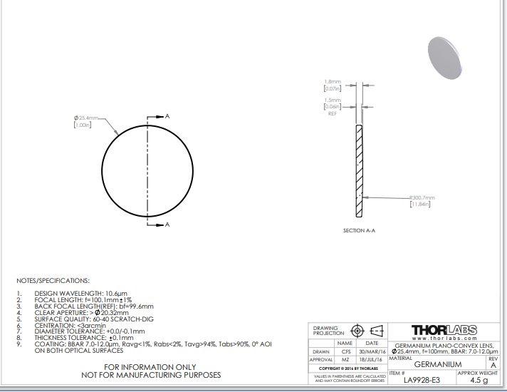 Thorlabs索雷博     LA9928-E3 平凸透镜