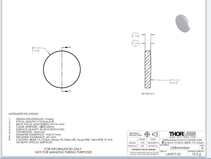 Thorlabs索雷博 LA9977-E3 平凸透镜
