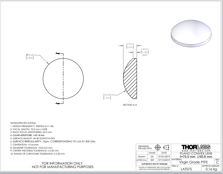 Thorlabs索雷博 LAT075 平凸透镜
