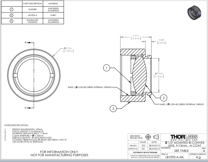 Thorlabs索雷博 LB1092-A-ML 双凸透镜