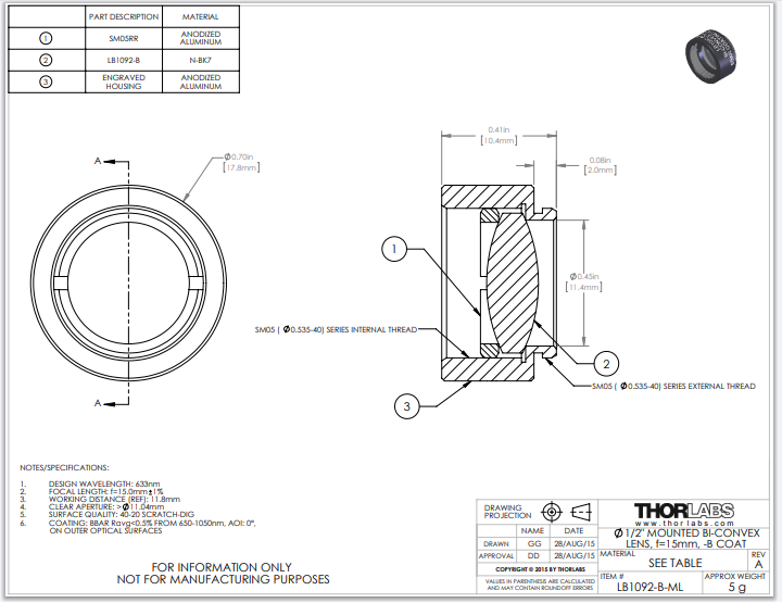 Thorlabs索雷博 LB1092-B-ML 双凸透镜