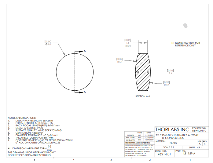 Thorlabs索雷博 LB1157-A 双凸透镜