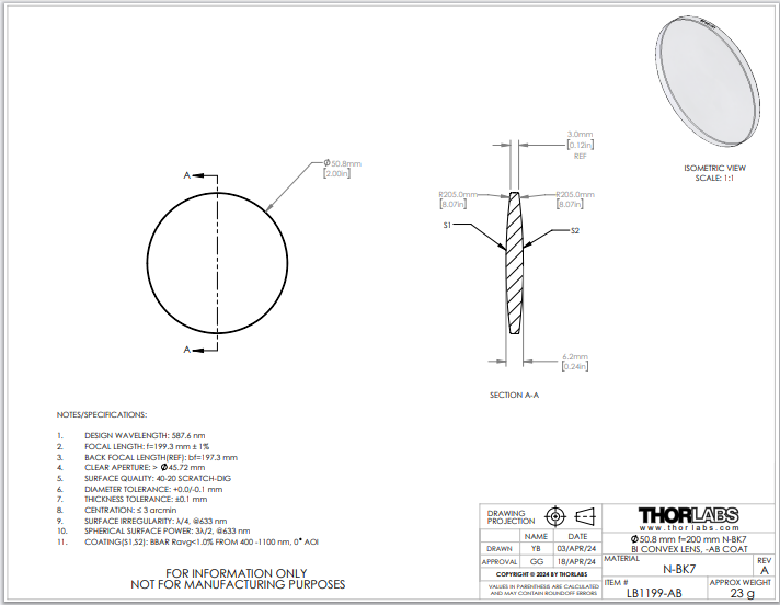 Thorlabs索雷博 LB1199-AB 双凸透镜