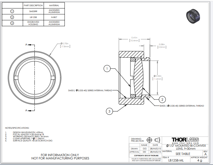 Thorlabs索雷博 LB1258-ML 双凸透镜