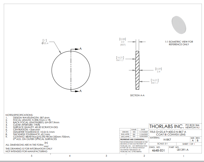 Thorlabs索雷博 LB1391-A 双凸透镜