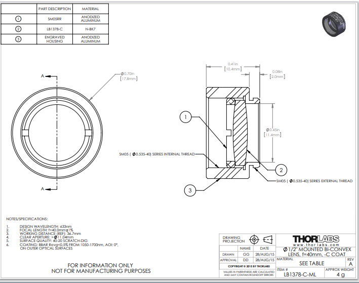 Thorlabs索雷博 LB1378-C-ML 双凸透镜