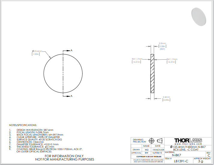 Thorlabs索雷博 LB1391-C 双凸透镜