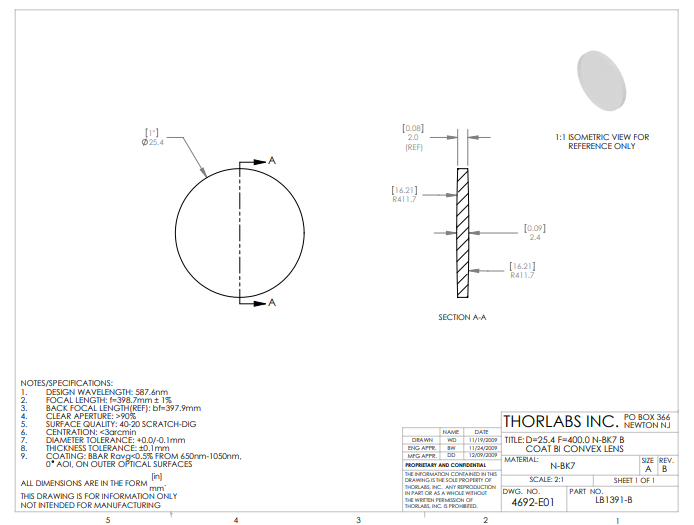 Thorlabs索雷博 LB1391-B 双凸透镜