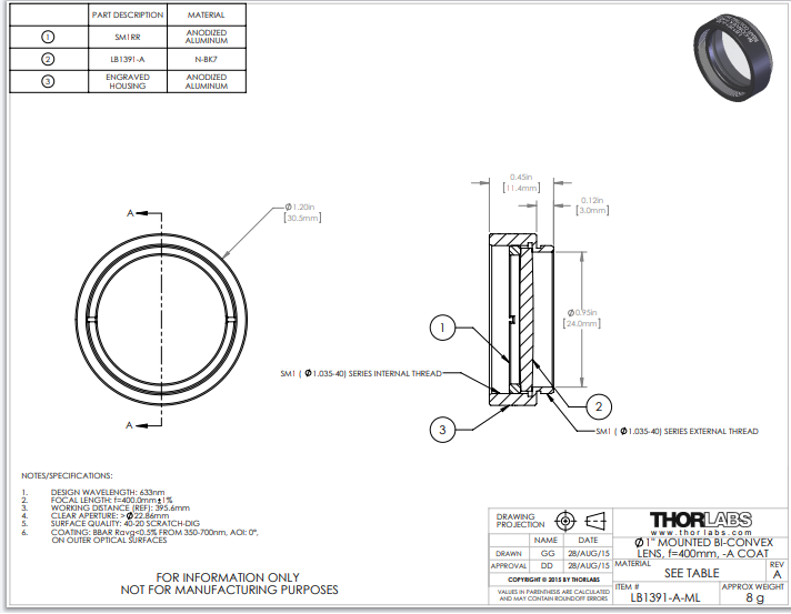 Thorlabs索雷博 LB1391-A-ML 双凸透镜