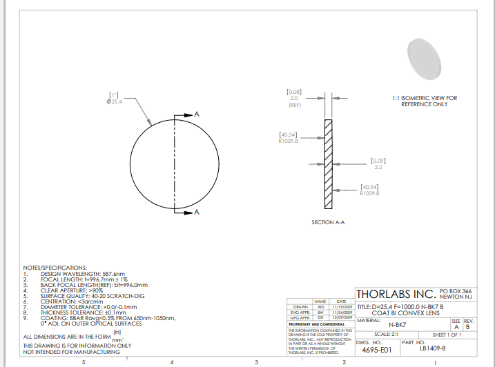 Thorlabs索雷博 LB1409-B 双凸透镜