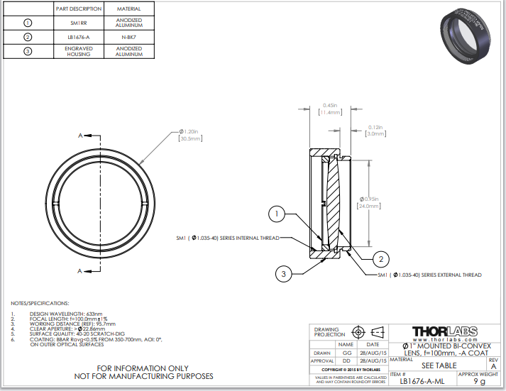 Thorlabs索雷博 LB1676-A-ML 双凸透镜