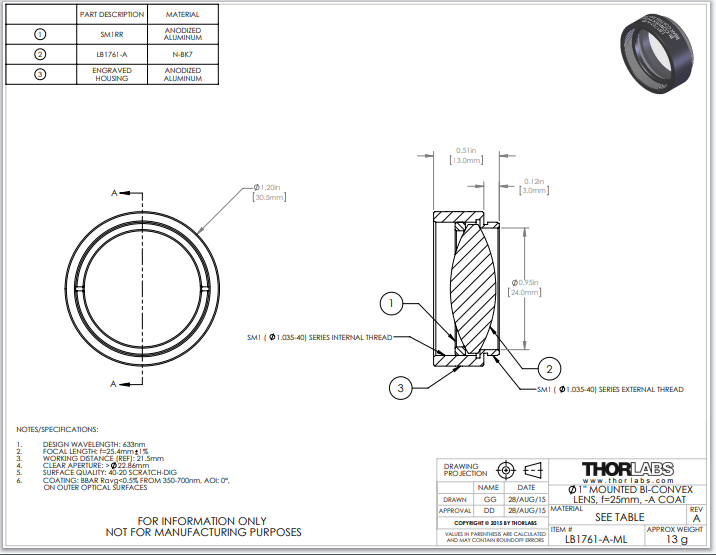 Thorlabs索雷博 LB1761-A-ML 双凸透镜