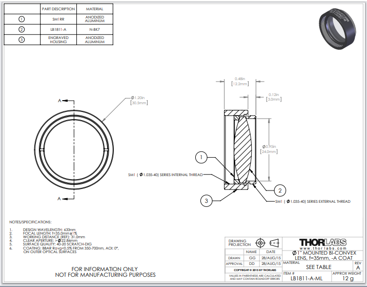 Thorlabs索雷博 LB1811-A-ML 双凸透镜
