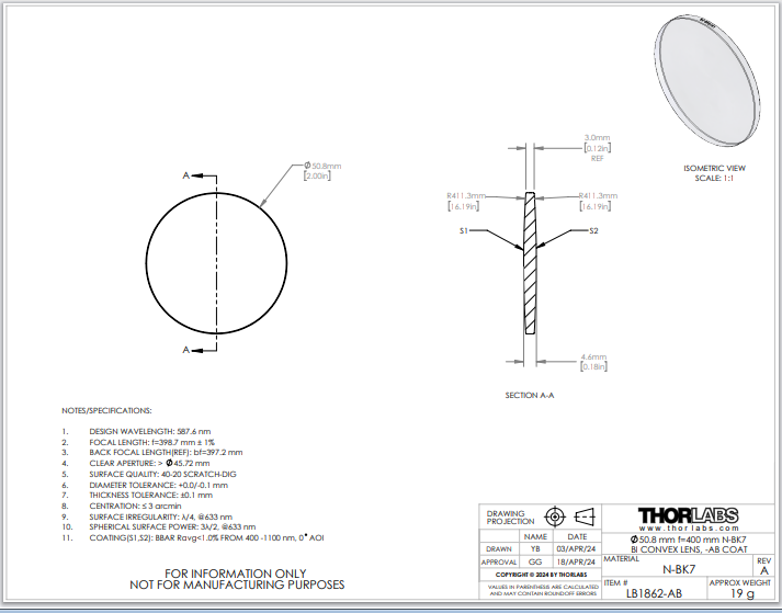 Thorlabs索雷博 LB1862-AB 双凸透镜