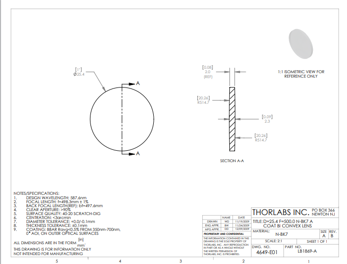 Thorlabs索雷博 LB1869-A 双凸透镜