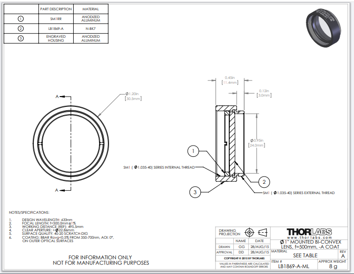 Thorlabs索雷博 LB1869-A-ML 双凸透镜