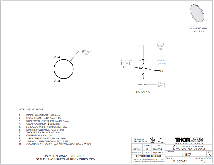 Thorlabs索雷博 LB1869-AB 双凸透镜