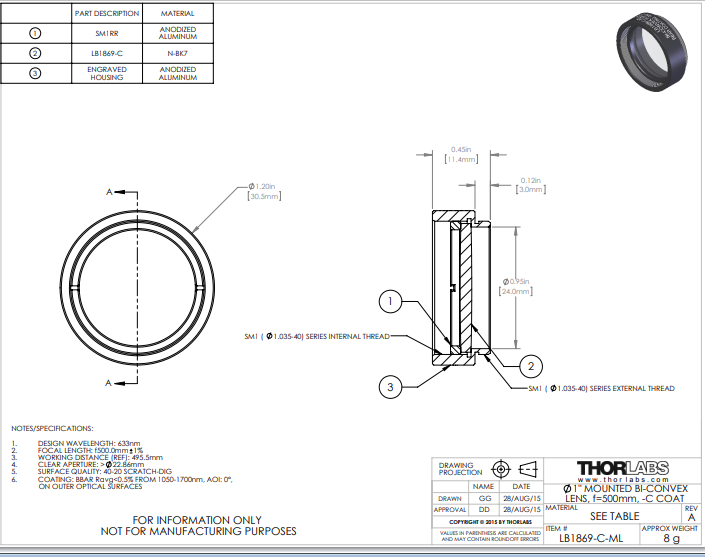 Thorlabs索雷博 LB1869-C-ML 双凸透镜
