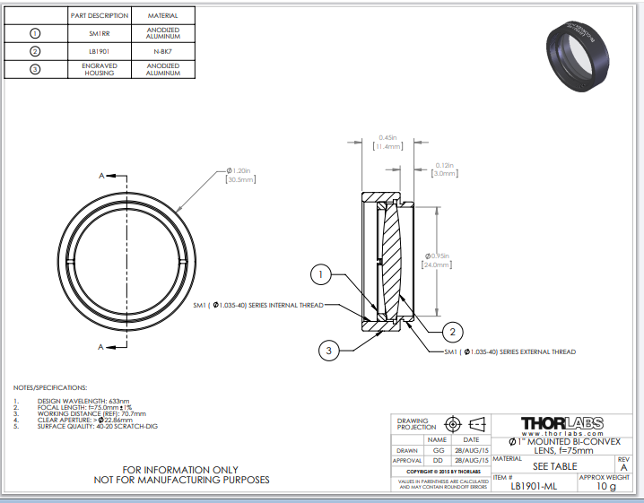 Thorlabs索雷博 LB1901-ML 双凸透镜