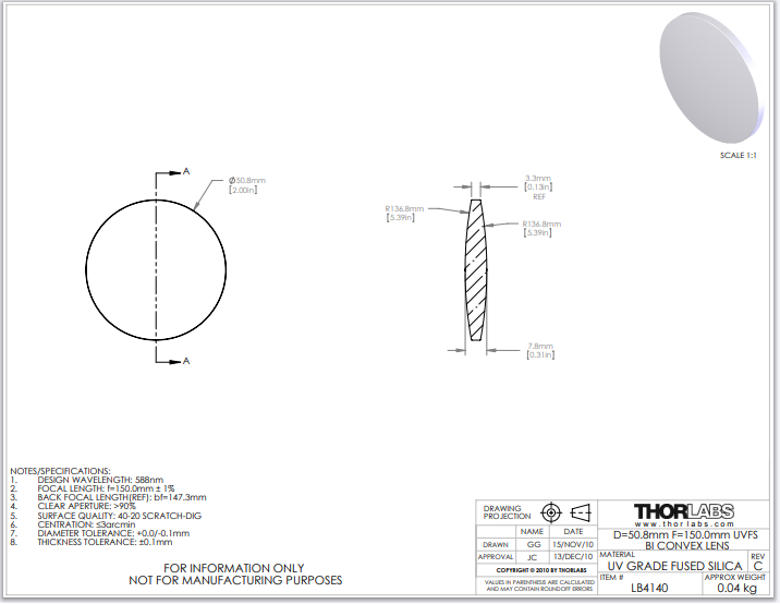 Thorlabs索雷博 LB4140 双凸透镜