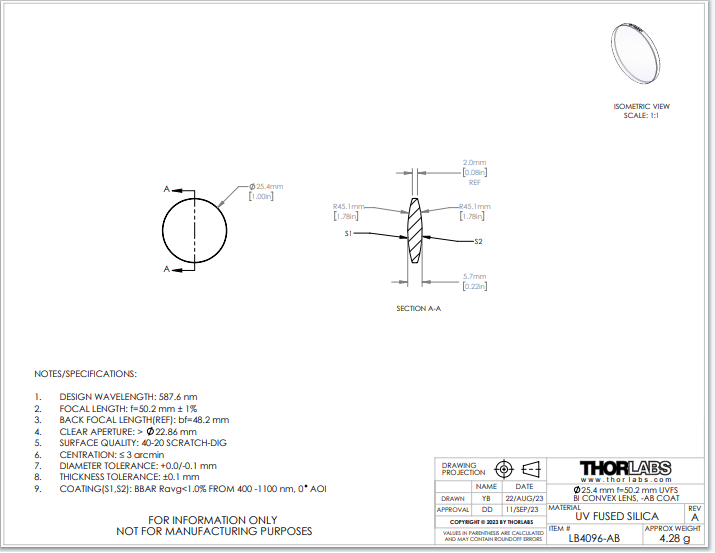 Thorlabs索雷博 LB4096-AB 双凸透镜