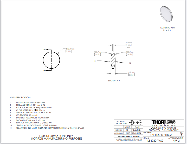 Thorlabs索雷博 LB4030-YAG 双凸透镜