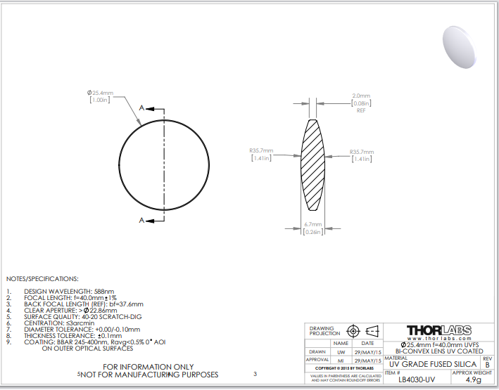 Thorlabs索雷博 LB4030-UV 双凸透镜