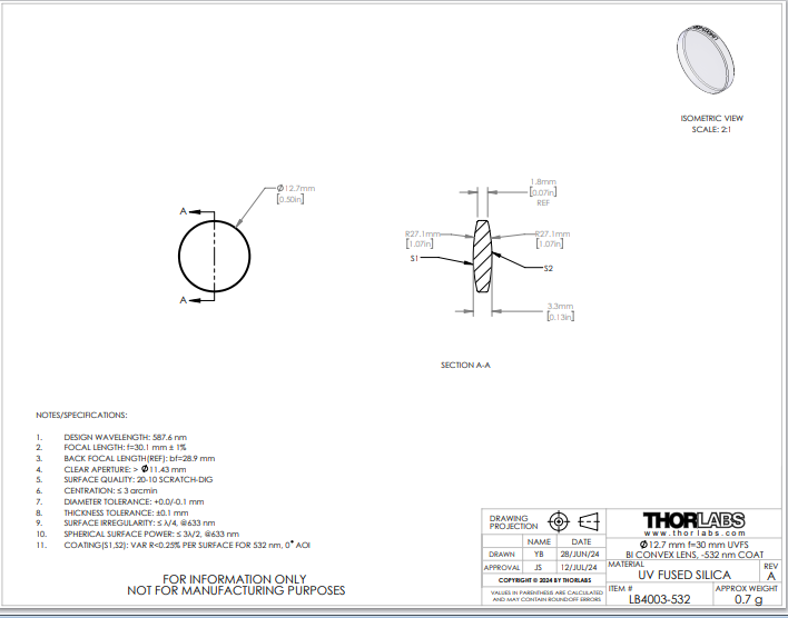 Thorlabs索雷博 LB4003-532 双凸透镜