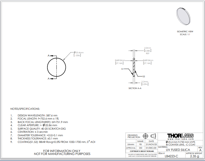 Thorlabs索雷博 LB4223-C 双凸透镜