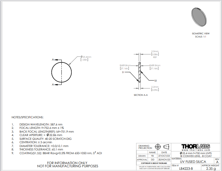 Thorlabs索雷博 LB4223-B 双凸透镜