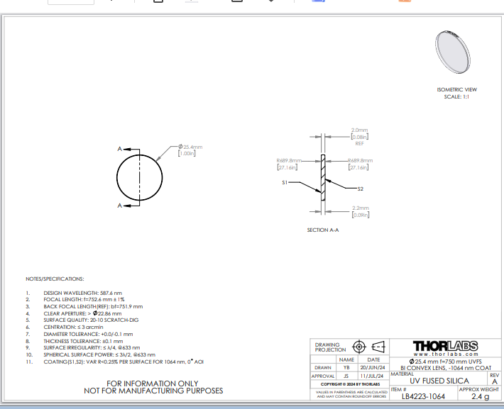 Thorlabs索雷博     LB4223-1064 双凸透镜