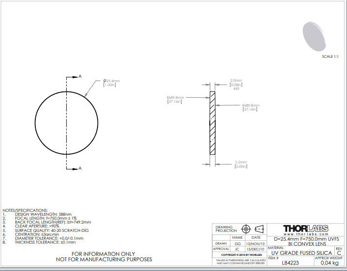 Thorlabs索雷博 LB4223 双凸透镜