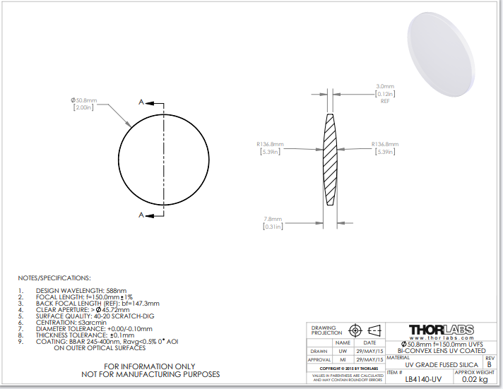 Thorlabs索雷博 LB4140-UV 双凸透镜