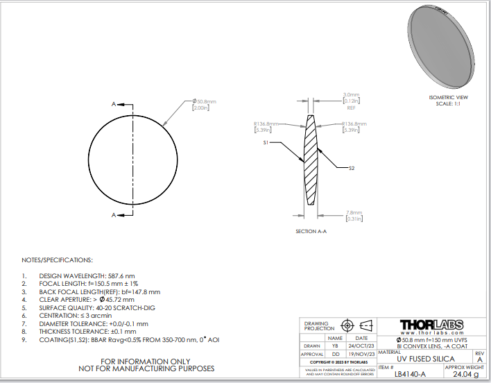 Thorlabs索雷博 LB4140-A 双凸透镜