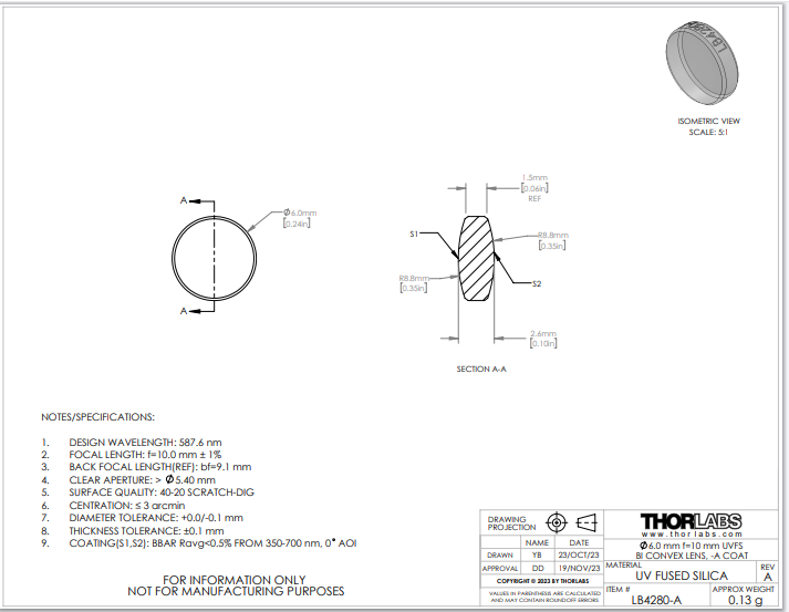 Thorlabs索雷博 LB4280-A 双凸透镜