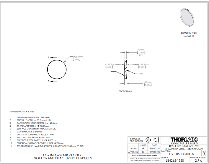 Thorlabs索雷博 LB4265-1550 双凸透镜