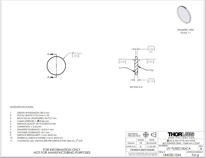 Thorlabs索雷博 LB4330-1064 双凸透镜