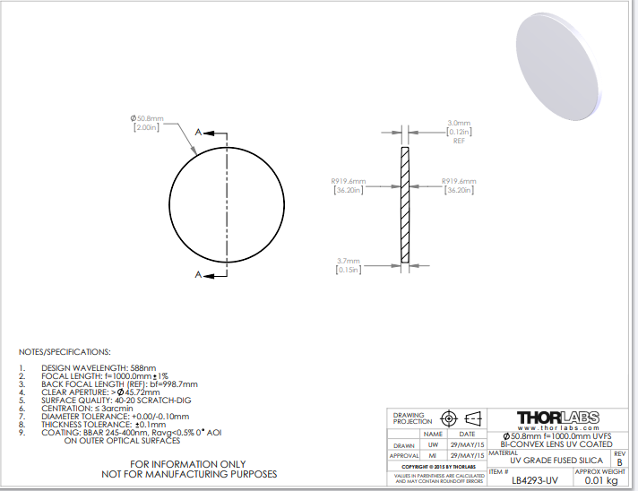 Thorlabs索雷博 LB4293-UV 双凸透镜