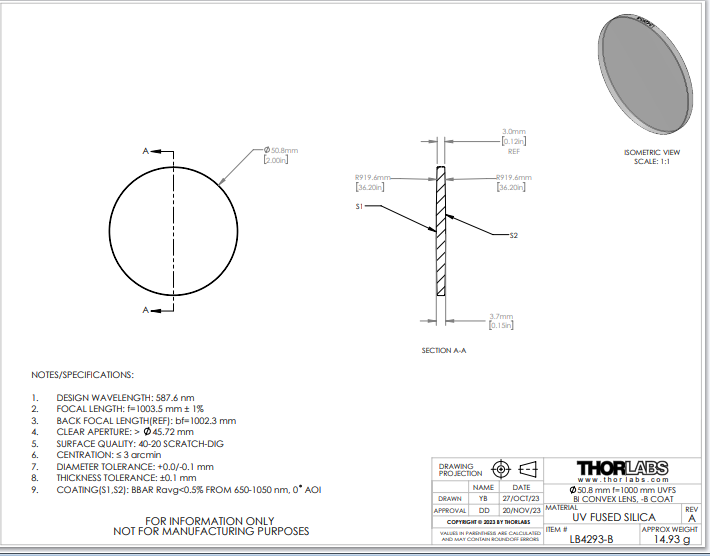 Thorlabs索雷博 LB4293-B 双凸透镜