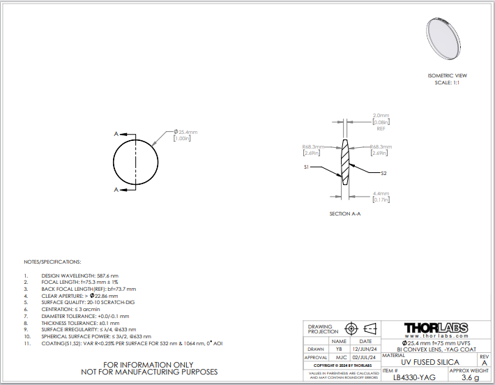 Thorlabs索雷博 LB4330-YAG 双凸透镜