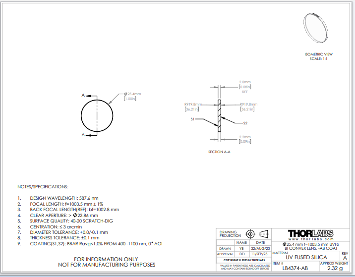 Thorlabs索雷博 LB4374-AB 双凸透镜