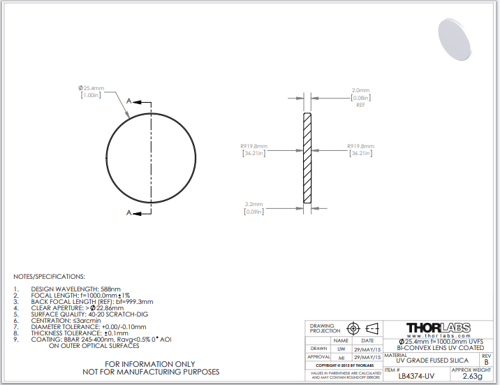 Thorlabs索雷博 LB4374-UV 双凸透镜