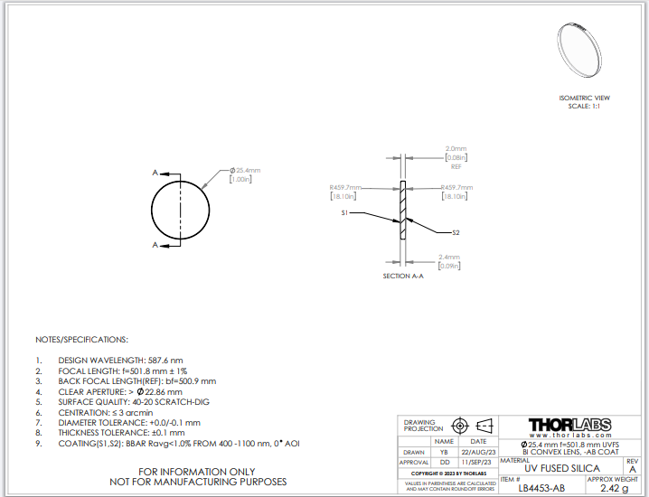 Thorlabs索雷博 LB4453-AB 双凸透镜