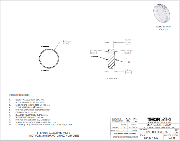 Thorlabs索雷博 LB4537-532 双凸透镜