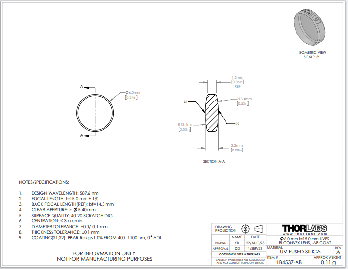 Thorlabs索雷博 LB4537-AB 双凸透镜
