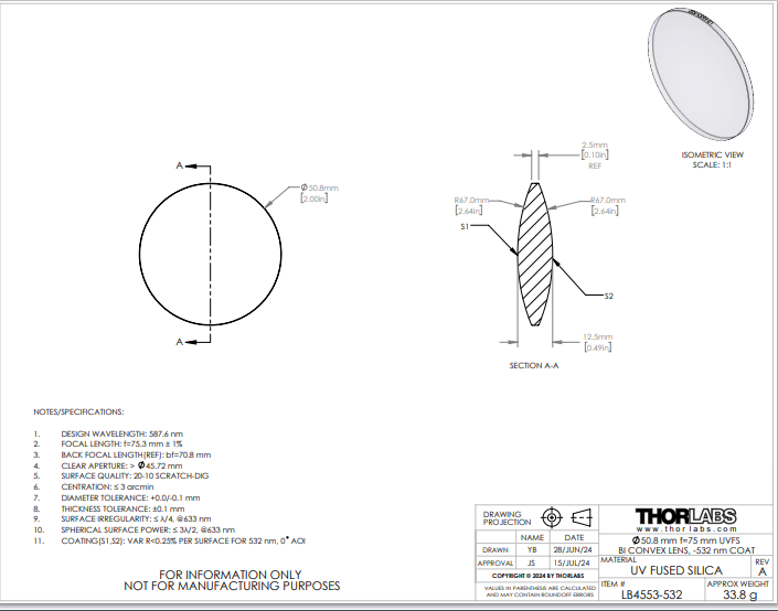 Thorlabs索雷博 LB4553-532 双凸透镜