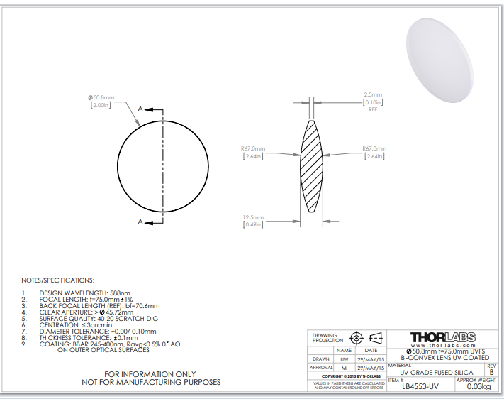 Thorlabs索雷博 LB4553-UV 双凸透镜