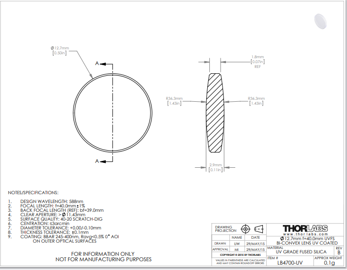 Thorlabs索雷博 LB4700-UV 双凸透镜