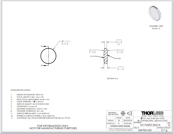 Thorlabs索雷博 LB4700-532 双凸透镜